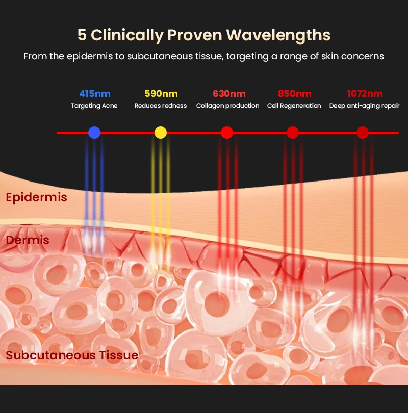 2. Lunghezze d'onda:• Blu: 415nm • giallo: 590nm • rosso: 630nm • vicino a infrarossi: 850NM • Far-infrarosso: 1072nm | |