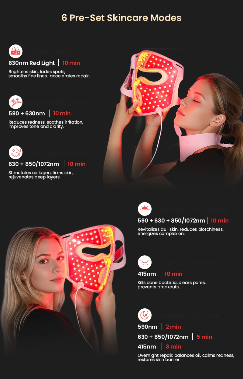 • Modalità per la cura della pelle mattutina: 590 + 630 + 850/1072nm per 10 minuti • Modalità di trattamento dell'acne: 415nm per 10 minuti • Modalità di cura notturna: 590nm (2 min) → 630 + 850/1072nm (5 min) → 415nm (3 min) | |