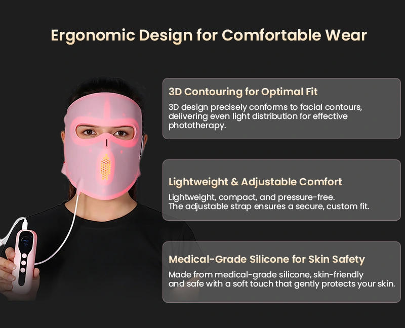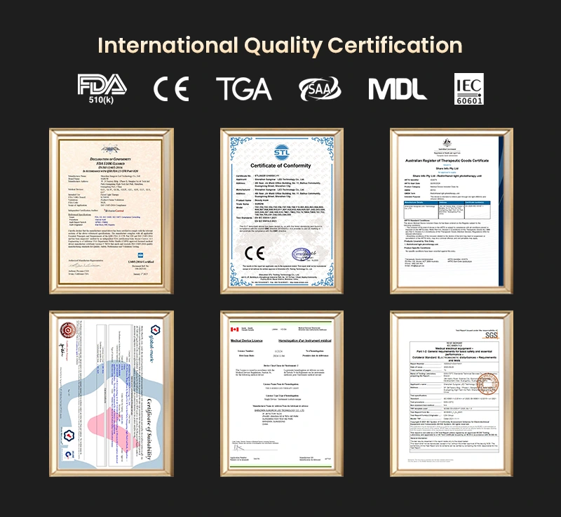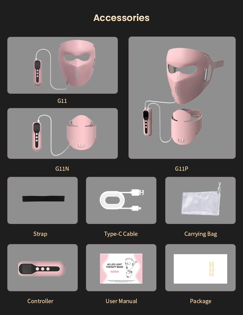 Modalità funzionali | 1. Tipo LED: 5050 quad-chip (Rapporto di lunghezza d'onda: 415:590:630:850/1072 = 1:1:1:1)Quantità a LED:• Maschera: 90 LED (12 sono 1072 nm)• Neckpiece: 57 LED |